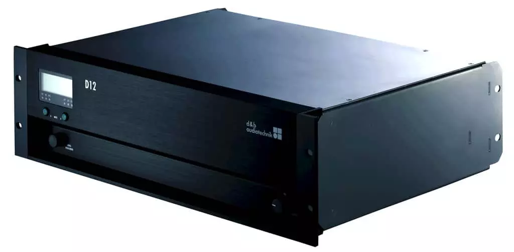 The 3 RU two channel D12 amplifier delivers medium to high power into low impedance loads between 4 and 16 ohms and is ideally suited for use in both mobile and installation environments. The D12 contains setups for all d&b loudspeakers and a linear mode. The signal delay capability enables user definable settings of up to 340 msec (=100 m/328.1 ft) to be applied independently to each channel. The same applies to the 4-band parametric equalizer, providing optional boost/cut or notch filtering. The D12 incorporates a digital rotary encoder and a LCD display to configure the amplifier. The D12 utilizes an autosensing switch mode power supply for mains voltages 120 V/230 V, 50 – 60 Hz (optional 100/200V). The D12 amplifier incorporates d&b SenseDrive for accurate control of LF drivers in d&b loudspeakers driven in 2-Way Active mode or in actively driven d&b subwoofers. When the D12 is fitted with EP5 connectors and appropriate 5 wire cabling, d&b SenseDrive can be used, resulting in an extremely precise bass performance even at high levels. NL4 and NL8 connector options are also available. RJ 45 connectors enable access to the Remote network via CAN-Bus. d&b System check verifies that the system performs within a predefined condition, whilst d&b Load monitoring enables an automatic and continuous impedance monitoring. Both can determine the status of an LF or HF driver in systems with multiple elements, even if these are crossed over passively.