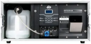 The ADJ Entourage is a professional grade touring Faze Machine built into a durable flight case. This pro Fazer offers a very quick warm-up time and produces a massive amount of atmosphere. The Entourage features an easy to read LED function display with fog timer, continuous fog and manual fog options. Connections include 3-pin and 5-pin DMX and PowerCon AC input. Uses high quality water based fog fluid.